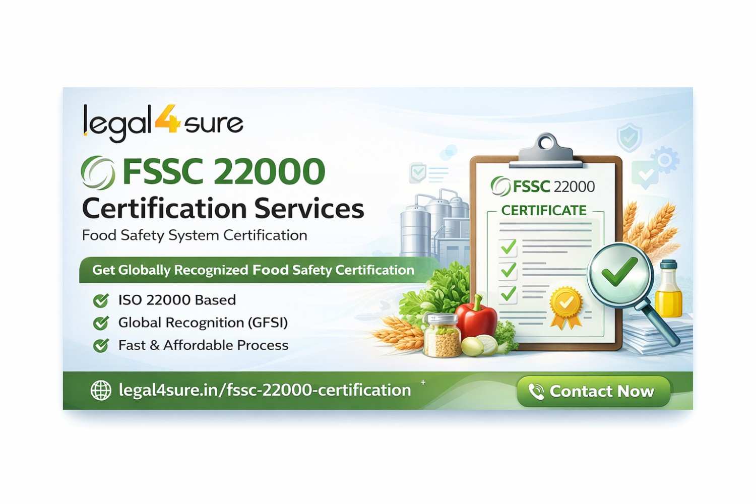 Get***professional FSSC***22000***Certification services***for***your***food***business***in***India. Ensure***global***food***safety***compliance, improve***brand***trust, and***meet***international***standards***with***expert***guidance. Affordable***pricing, quick***process, and***complete***support***from***documentation***to***audit. Contact***us***today!