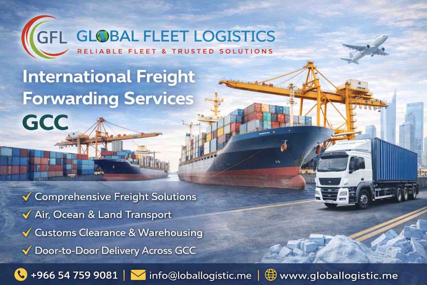 Searching***for international***freight***forwarding***services***GCC? Global***Logistic***offers***reliable***shipping***and***transportation***solutions***across***GCC***countries***with***efficient***customs***clearance***and***complete***logistics***support. We***manage***air***freight, sea***freight, and***land***freight***to***ensure***smooth***delivery***for***commercial***shipments***and***industrial***cargo. With***experienced***planning, strong***carrier***networks, and***real-time***coordination, we***reduce***delays***and***improve***cost***efficiency. Partner***with***Global***Logistic***for***trusted***freight***forwarding***in***GCC.