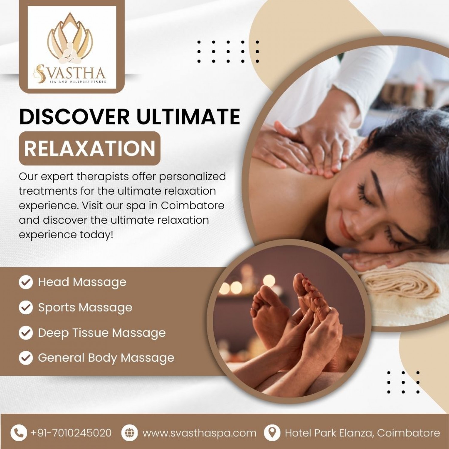 Looking for a good massage centre in Coimbatore? Come to Svastha Spa and Wellness Studio, a peaceful place where you can relax your body and mind. We have trained therapists who give different types of massages to help you feel better and stress-free. ????‍♀️ Our Services: Swedish Massage Deep Tissue Massage Aromatherapy Thai and Balinese Massage Full body massage Svastha Special Package Foot Massage (Reflexology) ???? Why Visit Us? ✔ Friendly and professional staff ✔ Clean and calm environment ✔ Special packages available ✔ High-quality oils and products ✔ One of the best spa in Coimbatore